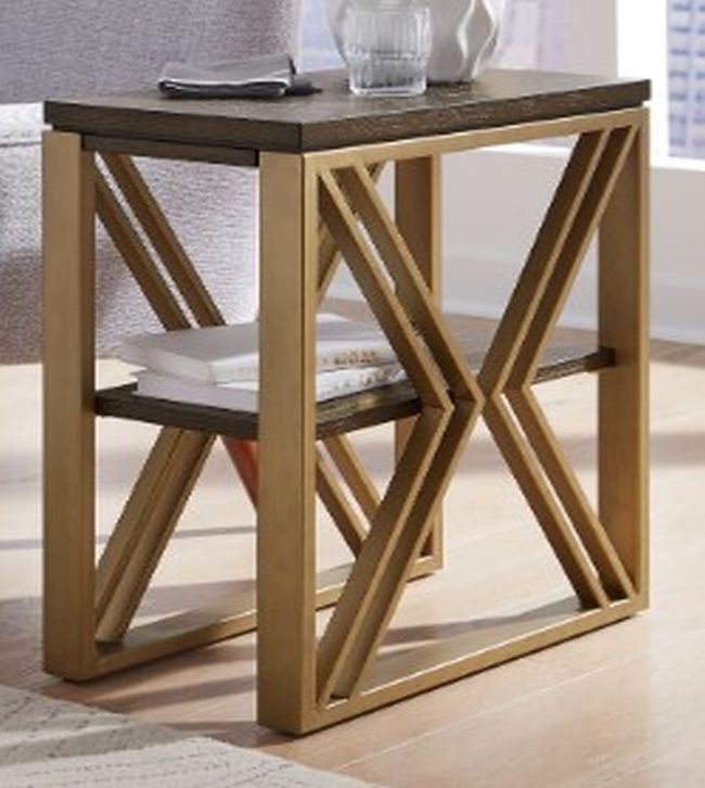 A modern contemporary mixed media collection with framed metal ends in Brass Finish and two-panel appearance Ash Veneer tops in Cocoa Finish. Angular stylized "X" metal ends complement the horizontal feel of the tops and shelves.Read More