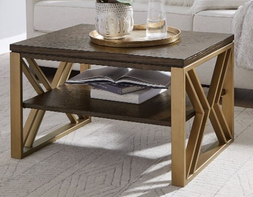 A modern contemporary mixed media collection with framed metal ends in Brass Finish and two-panel appearance Ash Veneer tops in Cocoa Finish. Angular stylized "X" metal ends complement the horizontal feel of the tops and shelves.Read More