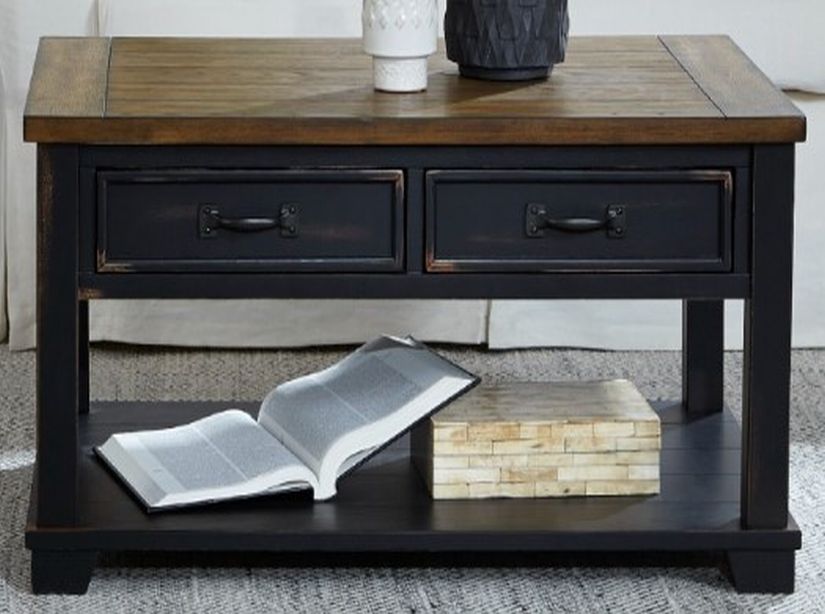 Incorporating farmhouse, cottage, and chic styling elements resulting in a cool, casual look. Poplar solids, Birch, and White Oak veneers. Two-tone finish pairs wire-brushed planked tops in a warm Pecan finish with a slightly rubbed-through black base. Framed inset drawer fronts with antique brass hardware add dimension and eye appeal.Read More
