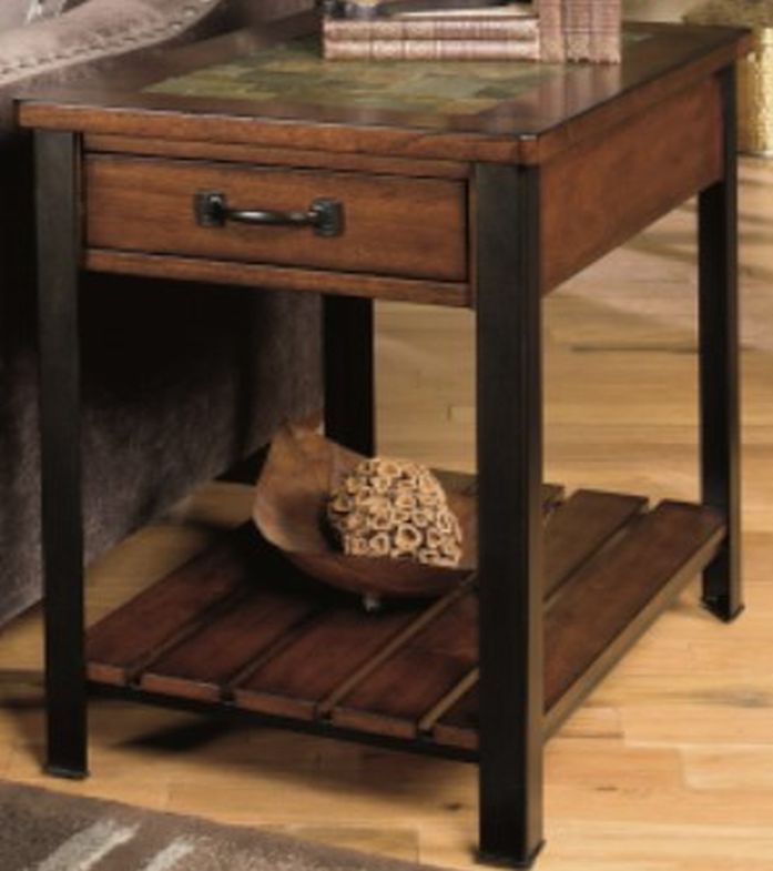 This collection is comprised of five table with plenty of storage and function designed into each piece. The cherry veneer is expertly finished with an aged tobacco finishing process that is further enhanced by natural slate tile tops and antique bronze metal legs and hardware. The slatted shelves on selected pieces only add to the style and function of this group to offer a major occasional fashion option to any consumer.