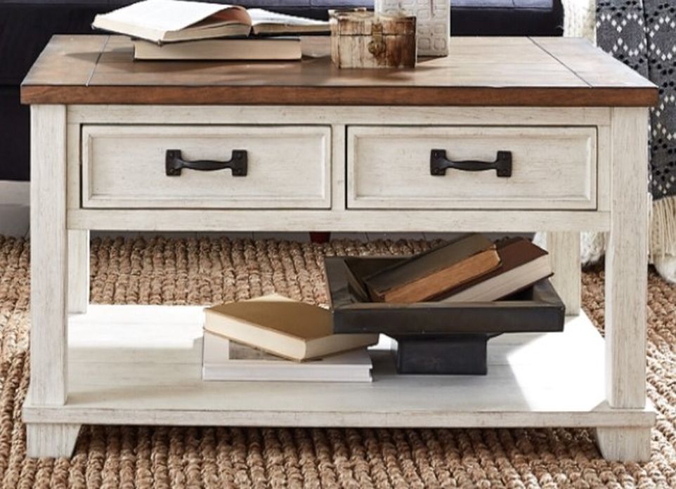 Incorporating farmhouse, cottage, and chic styling elements. Poplar solids and Birch veneers. Two-tone finish pairs distressed planked tops in a Toasted Almond finish with Rustic White bases. Framed inset drawer fronts with stat bronze hardware. Two cocktail sizes to fit any size room.Read More