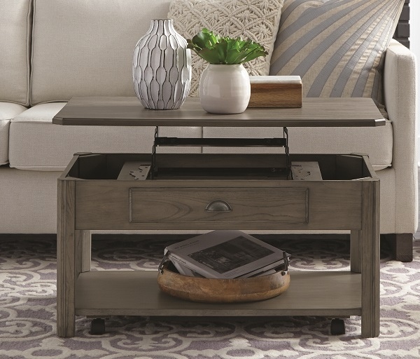 The lift top cocktail table offers a unique style that is sure to enhance the living space of any home decor. The rectangular cocktail table features a lift-top that adds function to this stylish table collection.