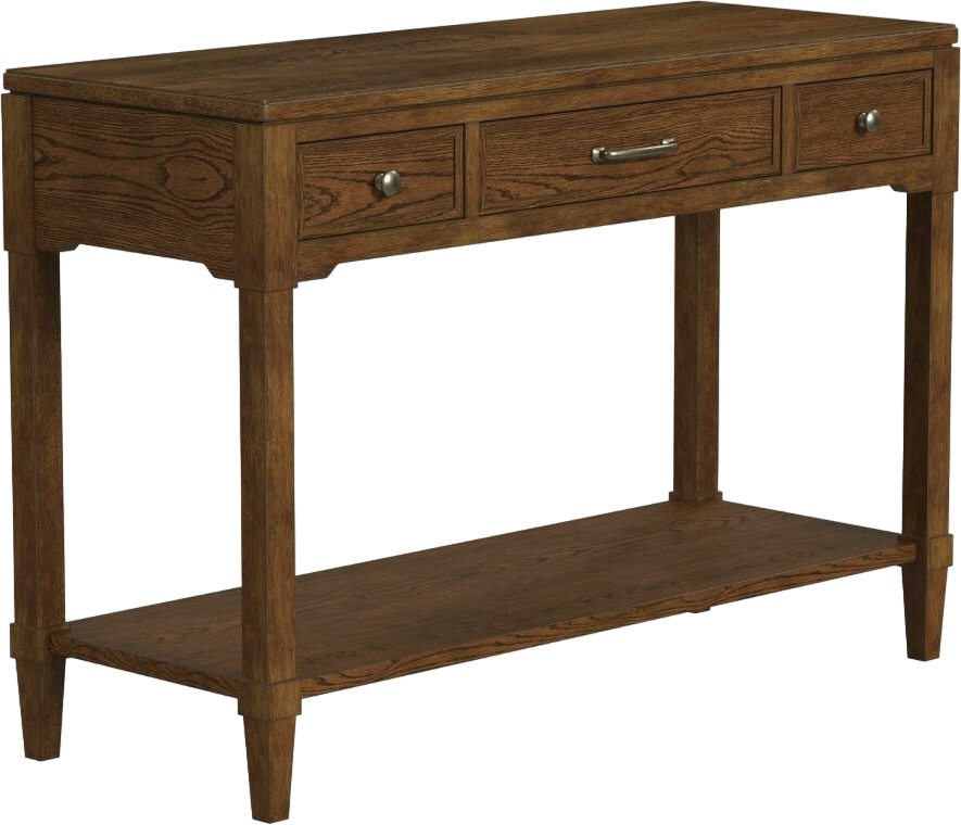 The top features a robust brown oak high-pressure laminate surface, providing a durable and elegant space for displaying your favorite decor, photos, or media devices. Below, the table is designed with three spacious drawers, perfect for storing remote controls, magazines, or other essentials, while the antique brass drawer handles add a touch of vintage charm that elevates the overall aesthetic. A convenient shelf beneath the drawers offers additional space for storage or display, allowing you to keep your living area organized and stylish. With its clean lines and transitional design, the Saddlebrook Console Table seamlessly blends with both traditional and contemporary settings, making it a versatile choice for any home. Whether used behind a sofa or as a media console, this table is sure to be a functional and attractive focal point in your space.