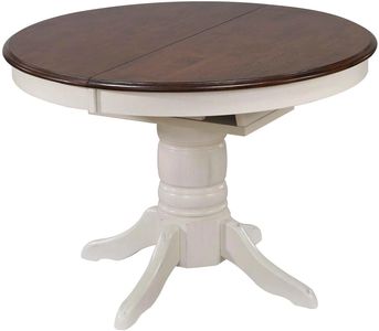 The Windswept Shores pedestal dining table features a solid wood construction in buttermilk/cherry rub-thru finish. This has a pedestal table base. This table has one 15" butterfly leaf to expand for any additional company.Read More